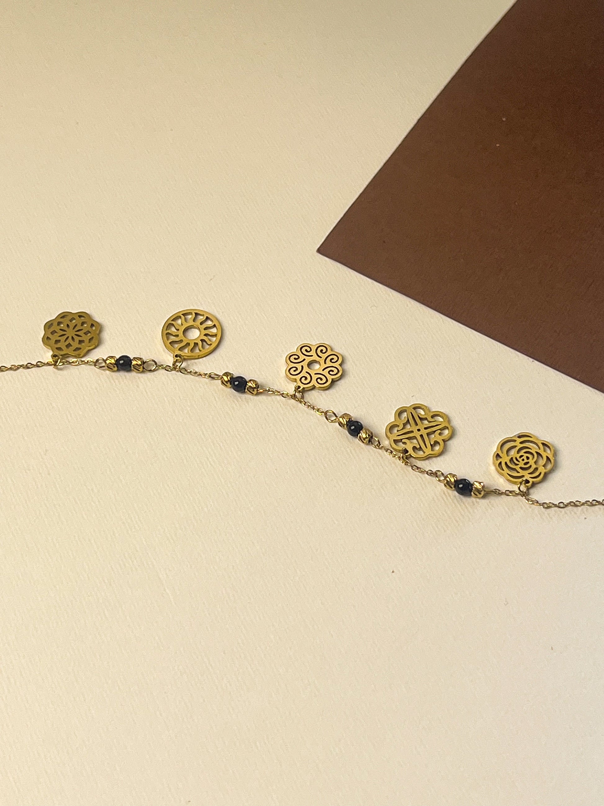 Petal-shaped charms and dark beads echo an old garden at dusk, where beauty grows quietly in hidden corners.